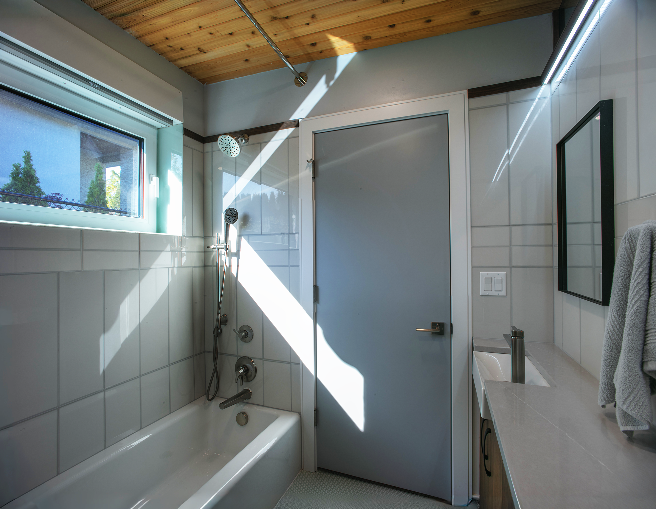 Bath with custom glass tilework. Lowered tub for cleaning kids and Aging-In-Place