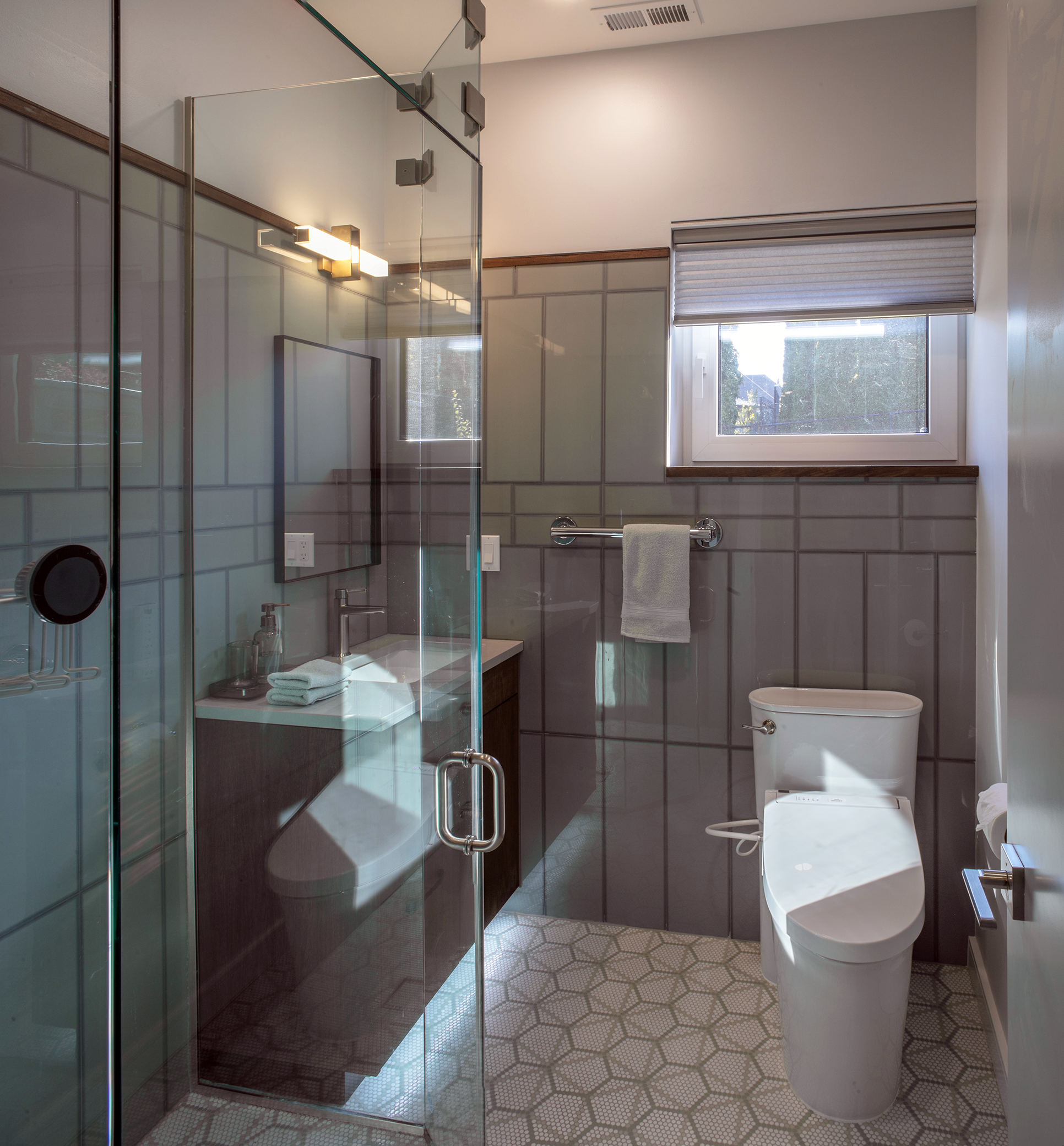 Guest bath with walnut trim and custom glass enclosure