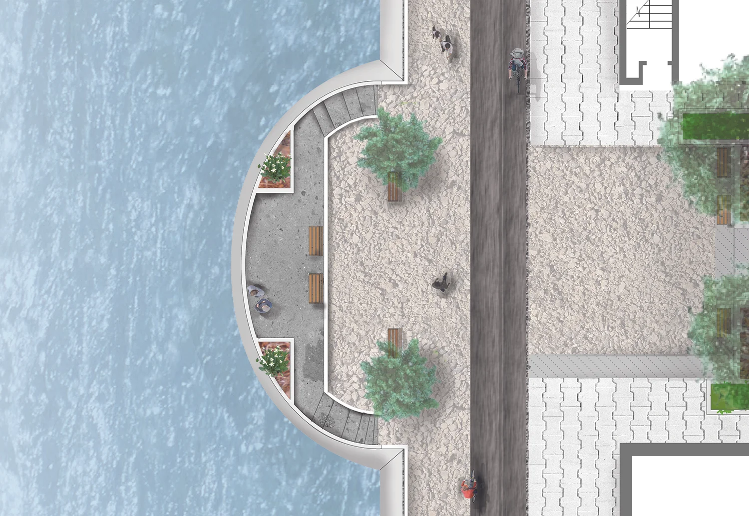 A 'NODE' for looking, resting reaching down to the water. A 2 way bike path and a sizable walking path...lots of room with out the cars in the way!